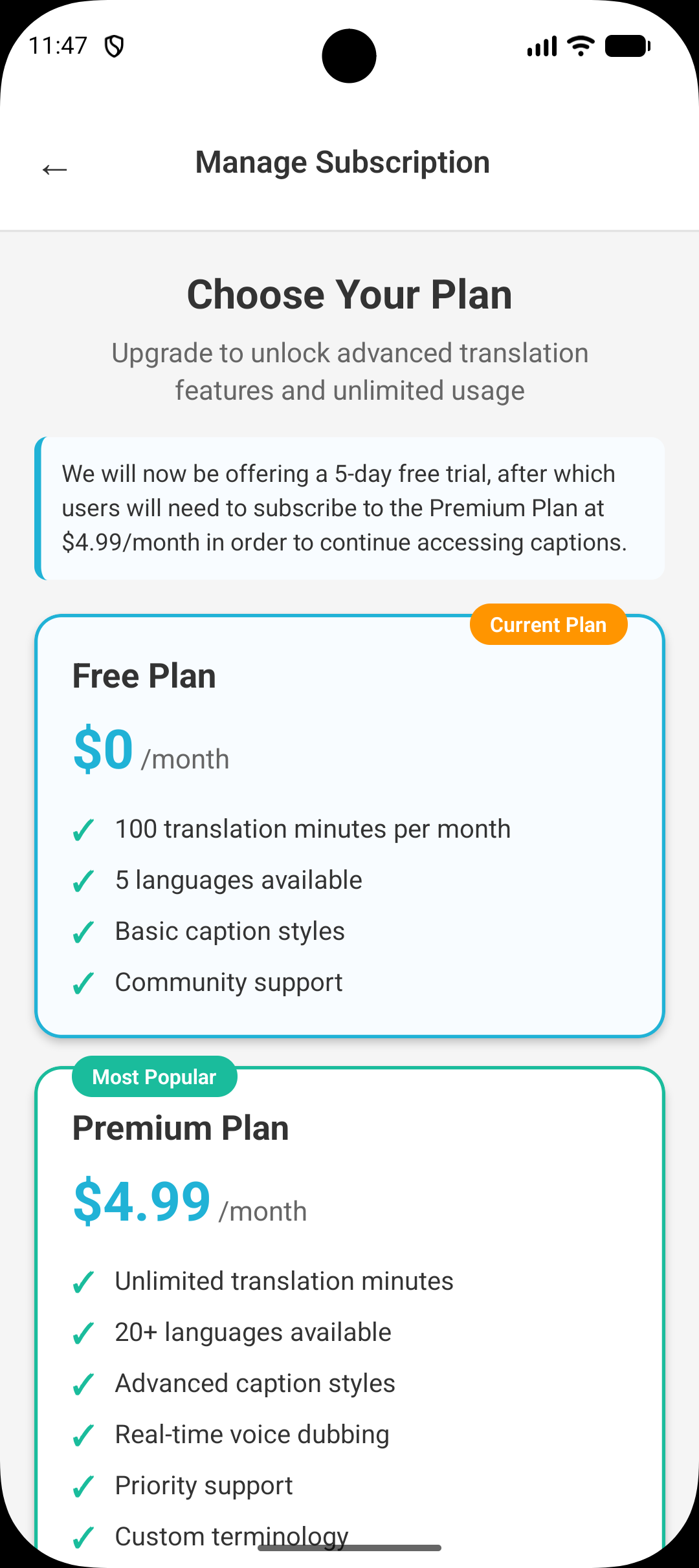 Global Captions provides live audio transcription and translation across all your apps. Perfect for accessibility, language learning, and noisy environments. The app detects audio from any app - Instagram, YouTube, or video calls - and displays real-time translated captions as an overlay.